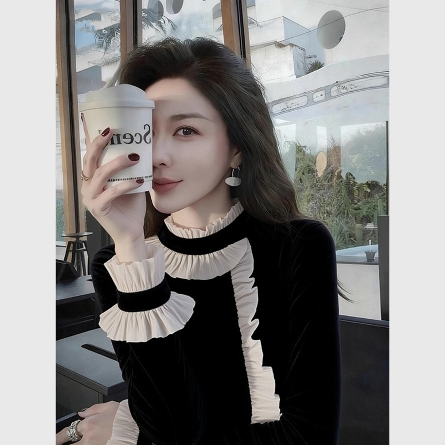 气质名媛黑色半高领荷叶边丝绒衬衫2025秋冬新款时髦洋气轻熟上衣