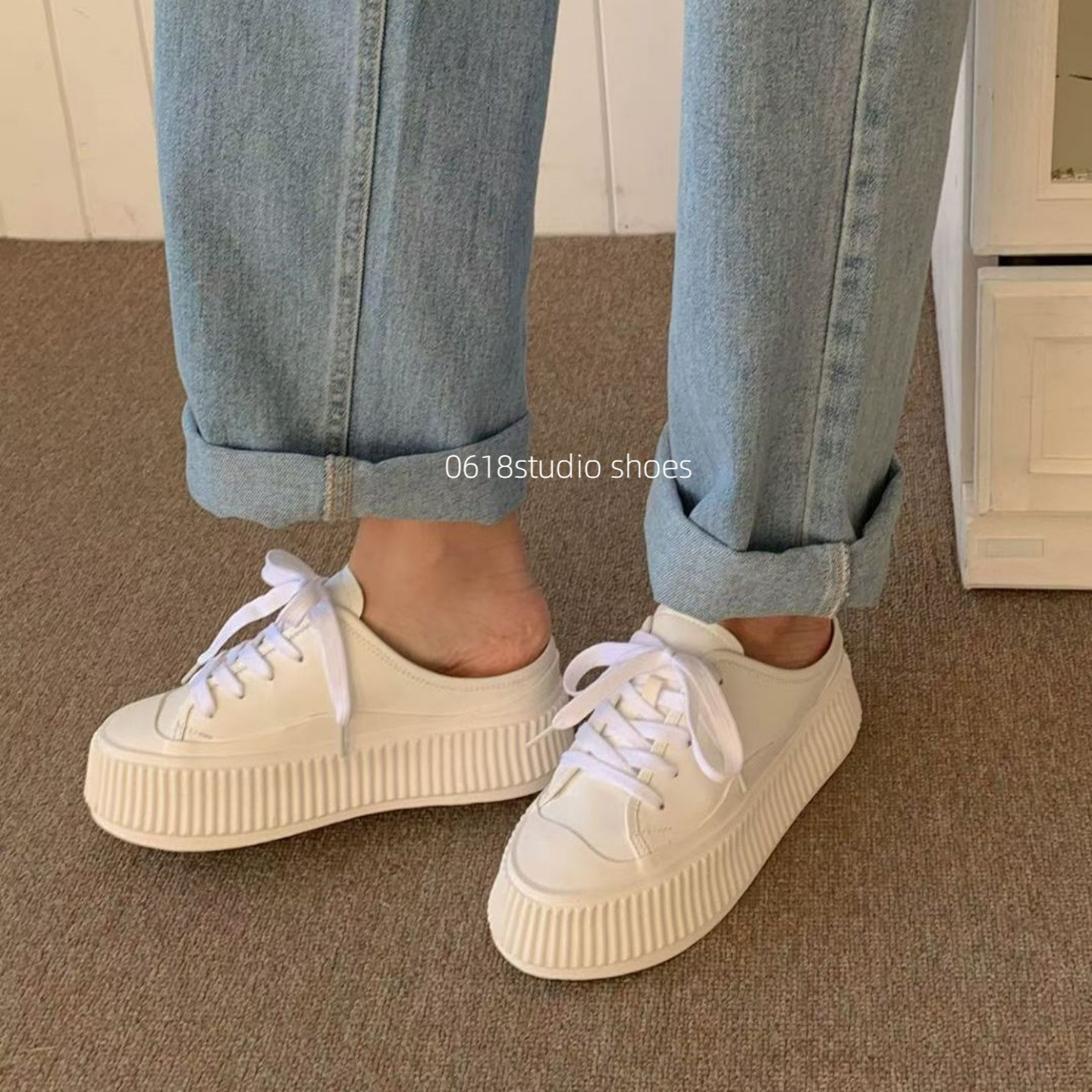 0618studio26年早春新款韩版厚底松糕鞋休闲系带增高饼干鞋包头拖