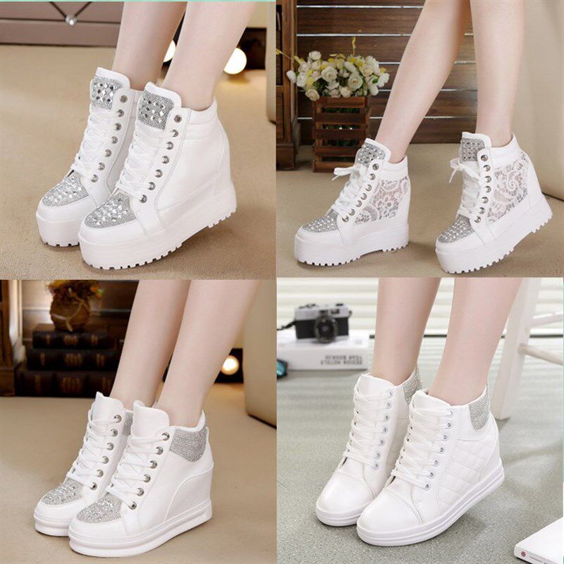 2021秋冬水钻内增高女鞋9cm白色韩版厚底松糕鞋高帮鞋女网纱休闲