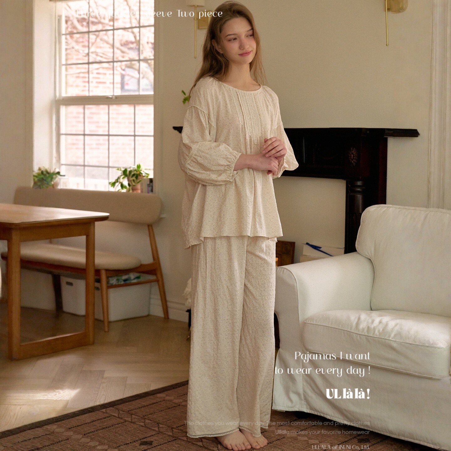 Ullala韩国乌拉拉纯棉七分袖长裤睡衣套装女春夏家居服宽松娃娃领