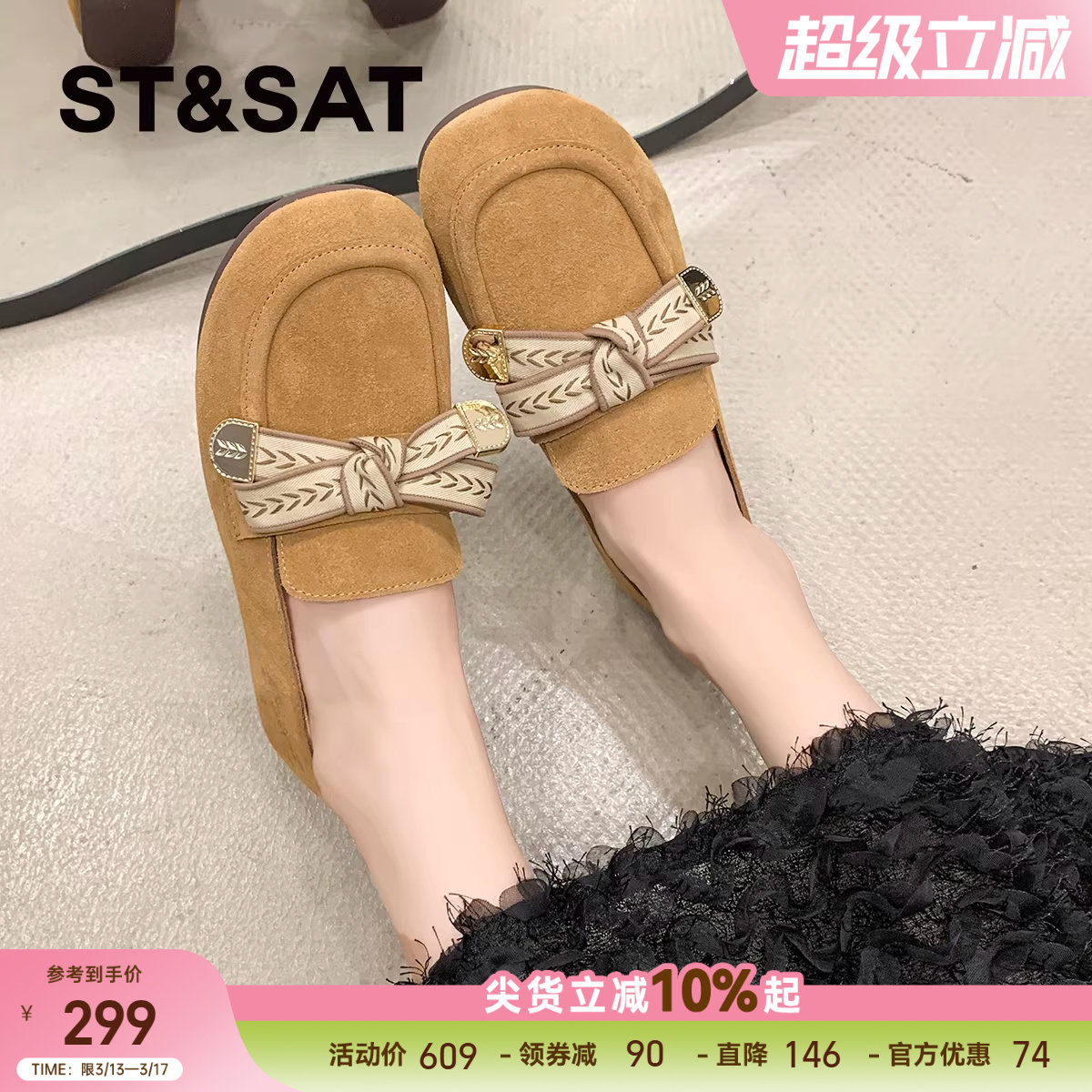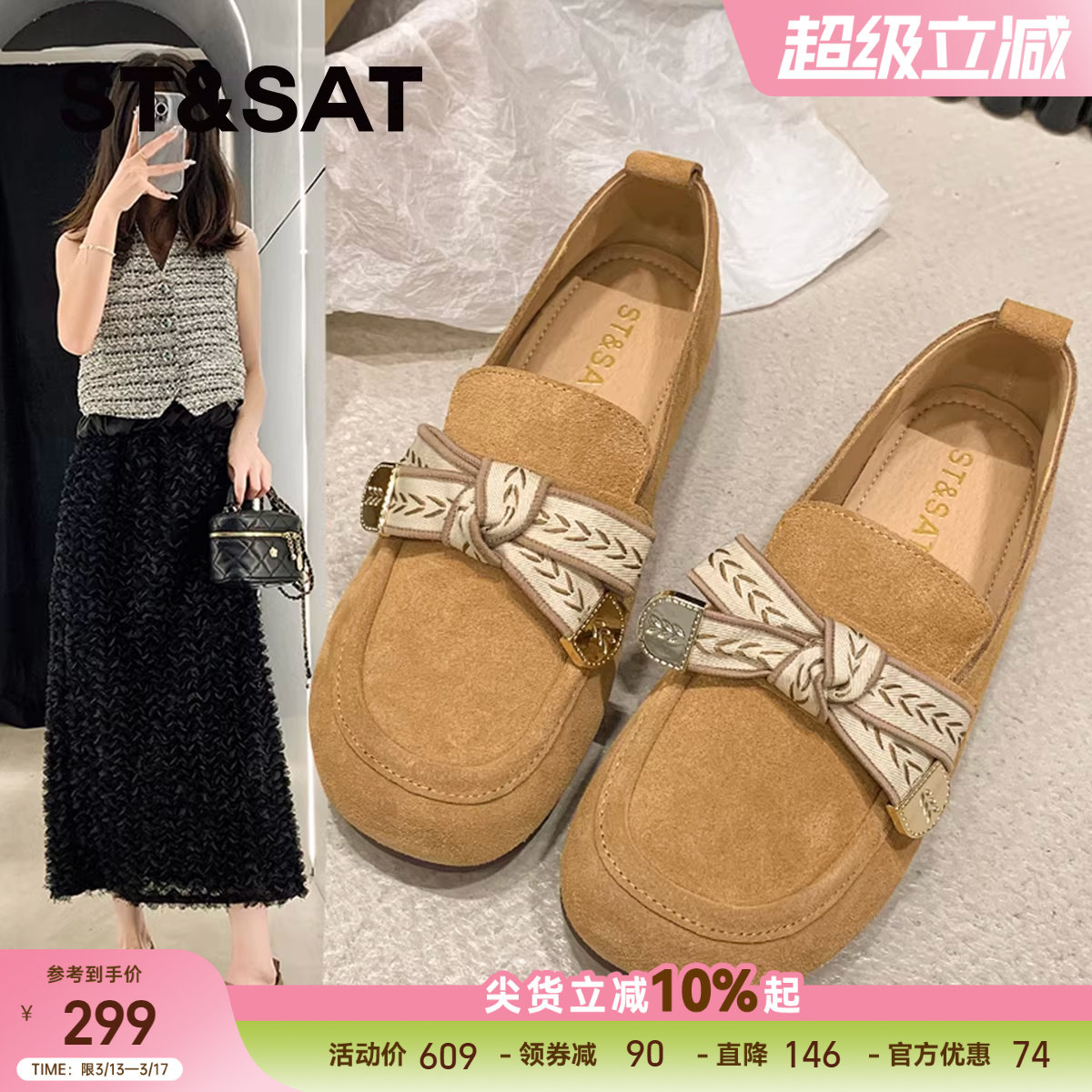 星期六真皮平底浅口单鞋女2025夏季新款淑女风配裙子豆豆鞋【直】