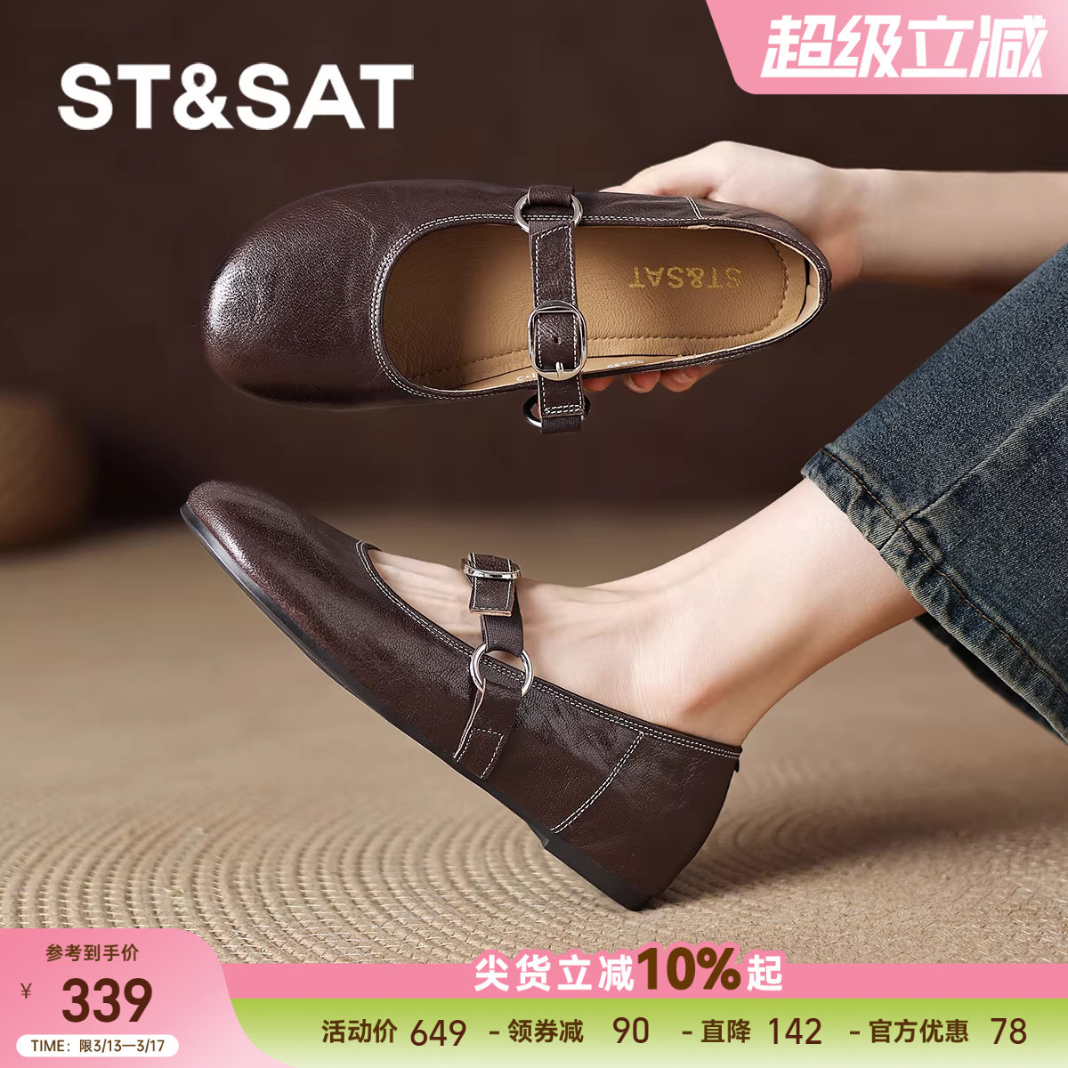 星期六棕色羊皮真皮鞋平底小单鞋女士女款玛丽珍法式豆豆春季女鞋