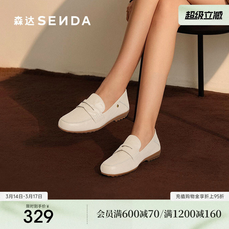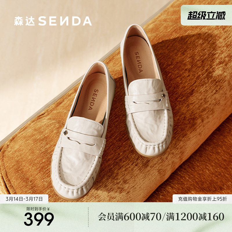 森达小羊皮乐福鞋女鞋新款软平底一脚蹬豆豆鞋真皮不累脚白色单鞋