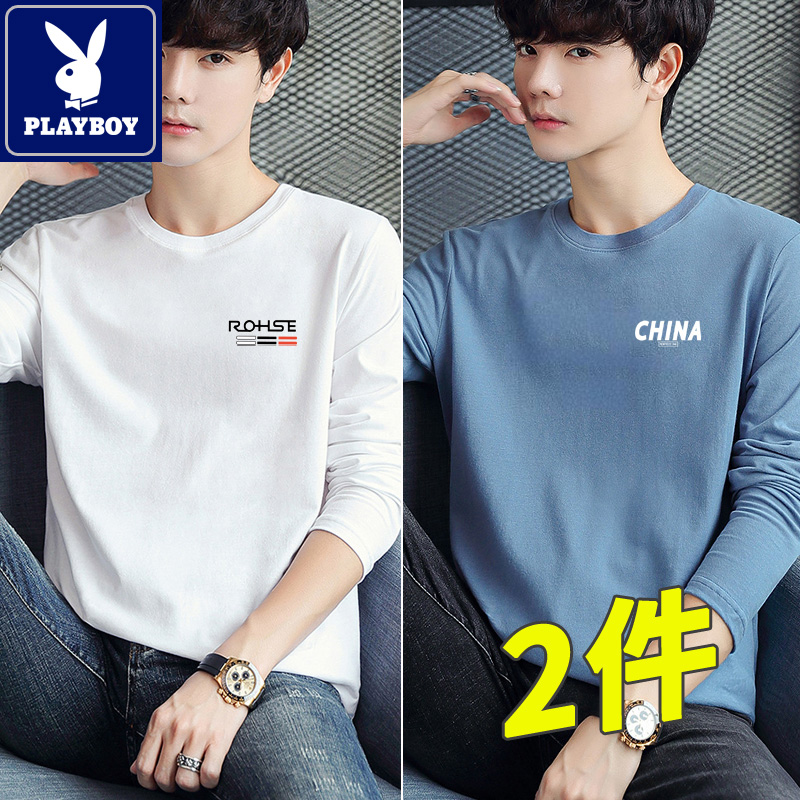 2件】花花公子长袖t恤男士青少年春秋纯棉体恤宽松上衣全棉打底衫