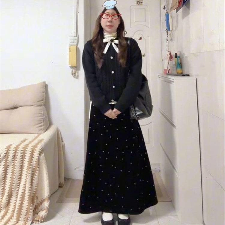 气质蝴蝶结针织开衫毛衣外套女学生+中长款波点半身裙+打底衬上衣