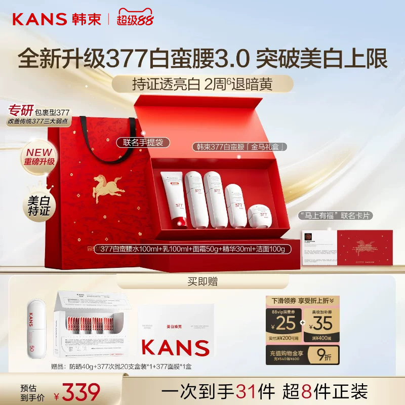 韩束377白蛮腰美白精华水乳套装美白淡斑去黄提亮肤色烟酰胺敏肌