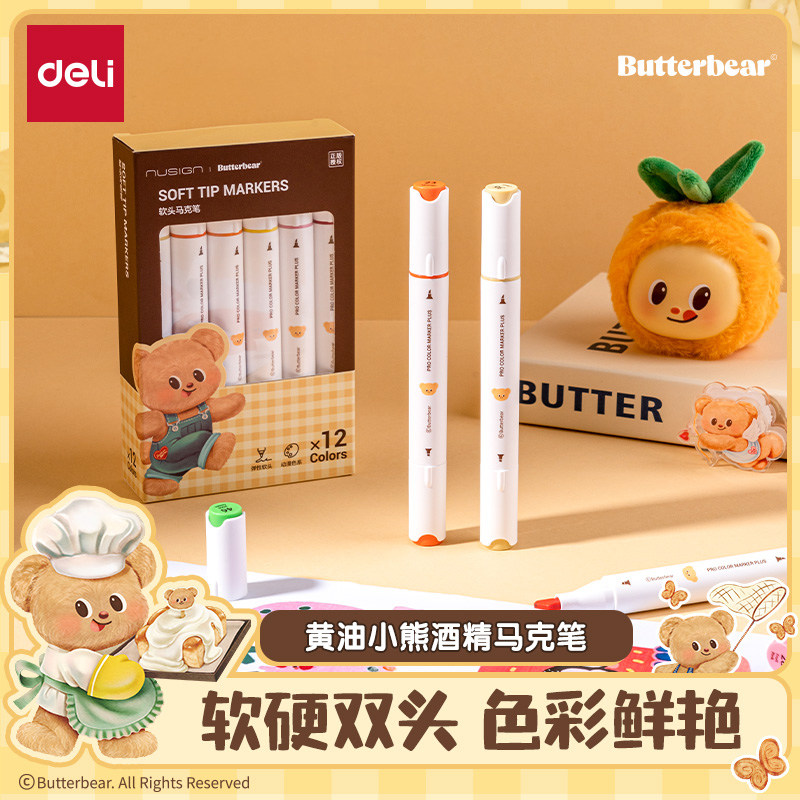 得力黄油小熊联名酒精马克笔软硬双头速干手绘水彩笔油性学生美术动漫设计儿童涂鸦幼儿园彩色画画