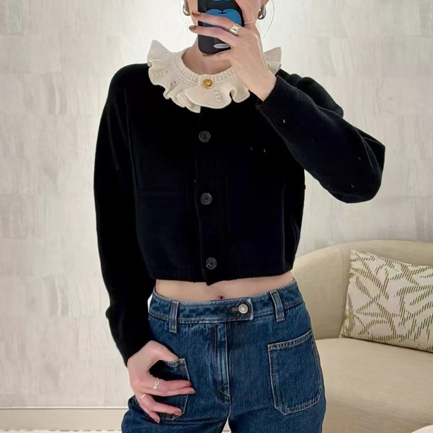 Dui版~甜美气质 绵羊毛黑色拼白色娃娃领针织短款开衫 25年新款