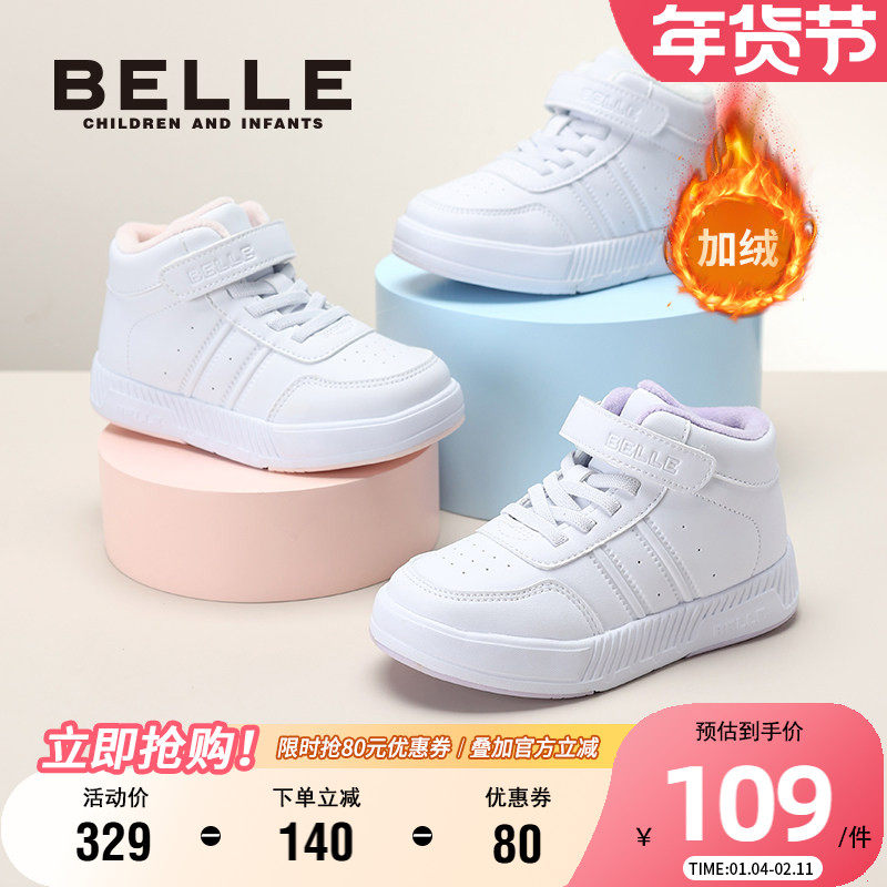 百丽童鞋时尚高帮板鞋冬季加绒保暖学生小白鞋男女童软底耐磨棉鞋