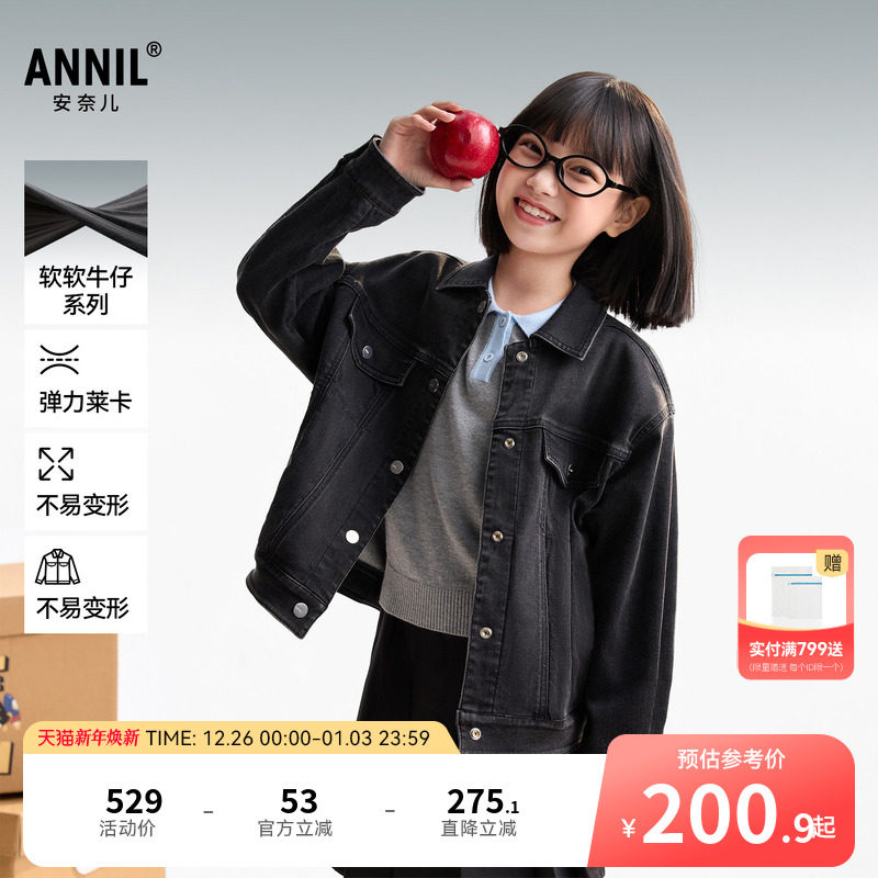 安奈儿童装男童女童牛仔外套2025秋新款休闲黑色弹力宽松时尚上衣