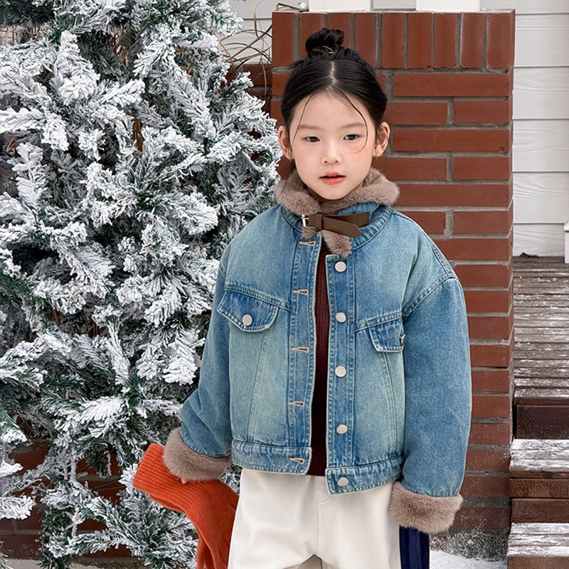 韩版童装2025冬季新款女童气质毛领保暖外套儿童加绒休闲牛仔外套
