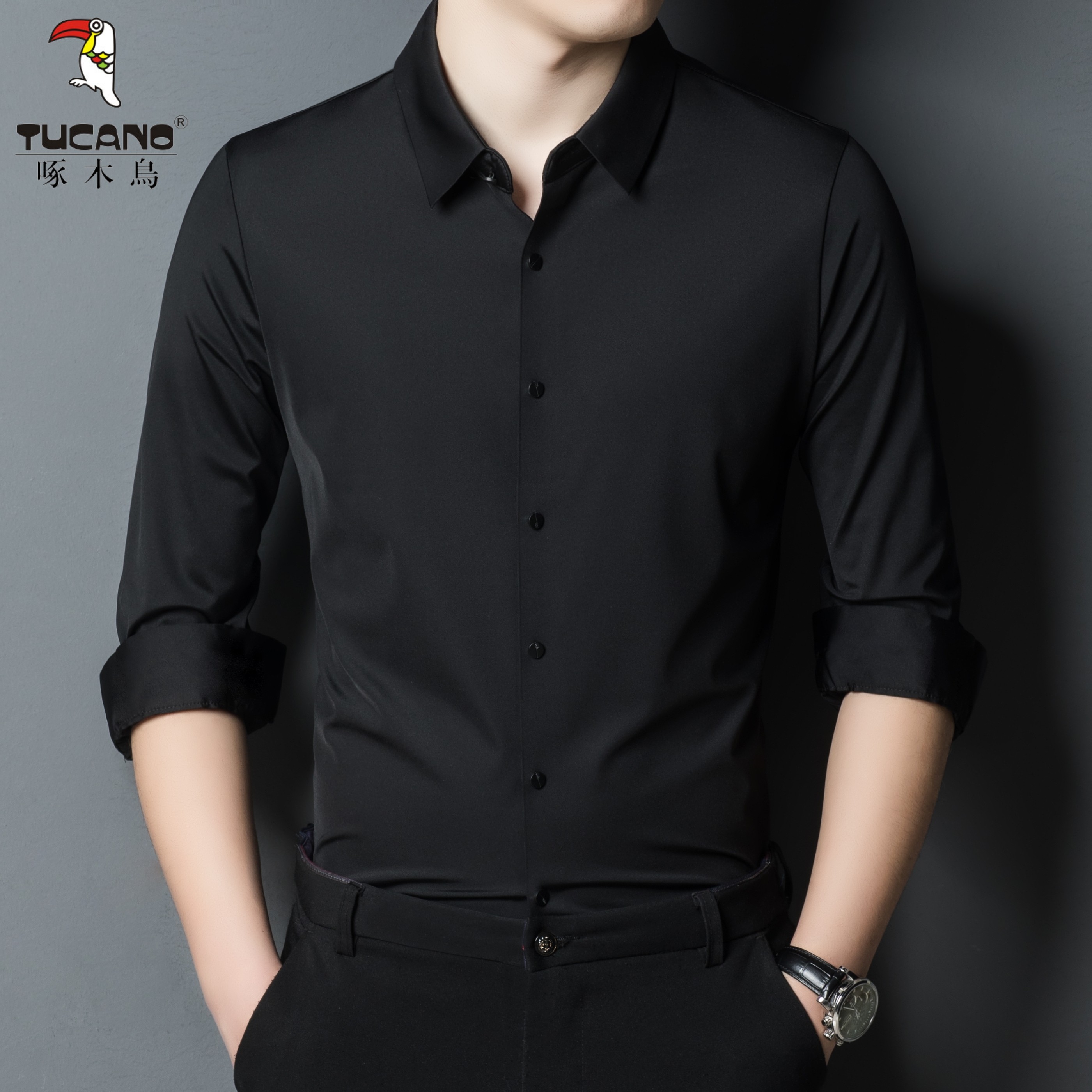 啄木鸟无痕黑色衬衫男长袖春秋新款垂感商务休闲免烫中年弹力衬衣