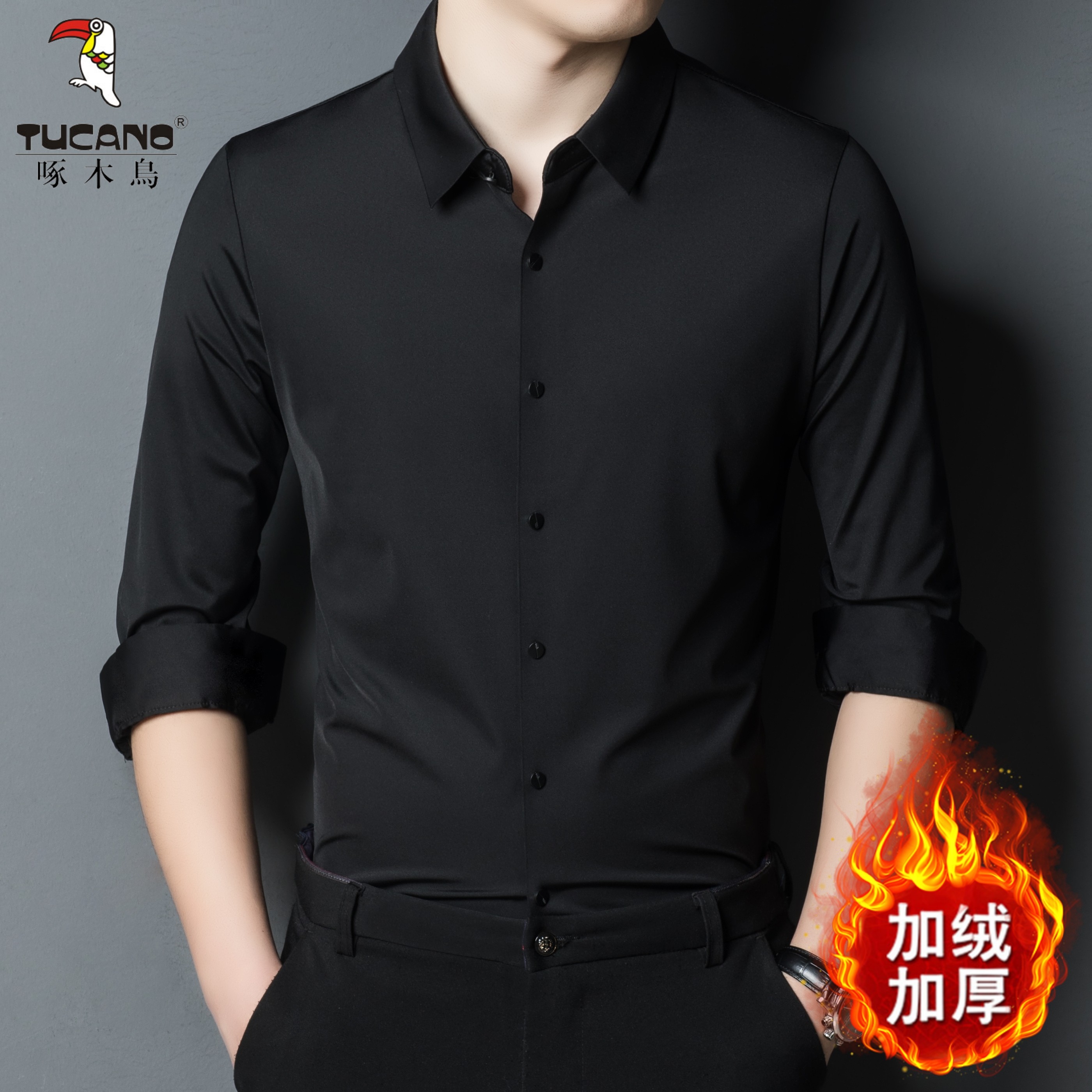 啄木鸟保暖黑色衬衫男士加绒加厚冬季中年商务无痕长袖衬衣一体绒