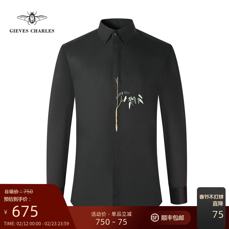 GIEVES CHARLES高端设计感青竹刺绣黑色衬衫男士高端时尚都市衬衫