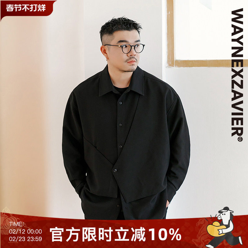韦恩泽维尔大码假两件黑色衬衫男宽松高级设计感翻领长袖衬衣8739