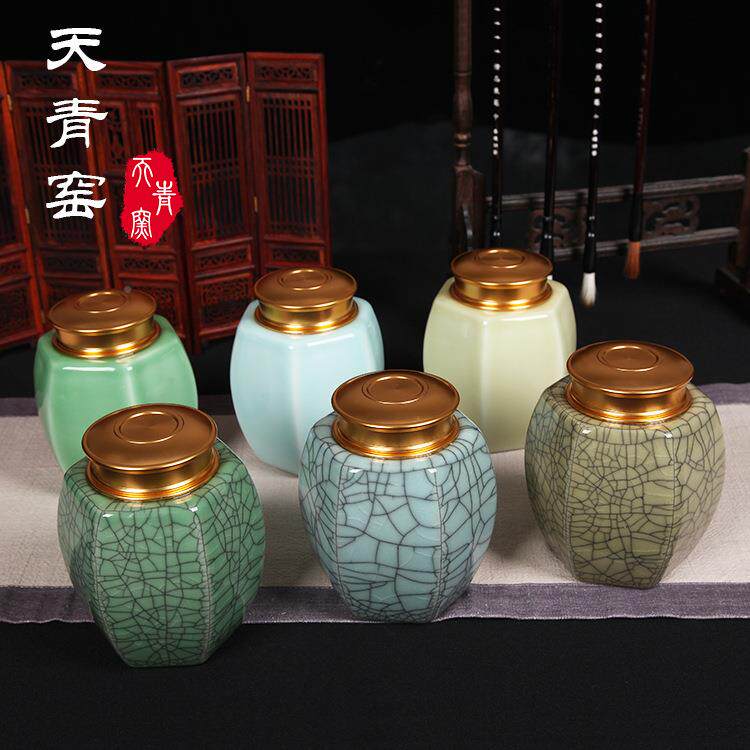青窑龙泉青瓷大号天圆OUG六角茶瓷罐哥窑冰裂陶储叶茶罐茶叶包装