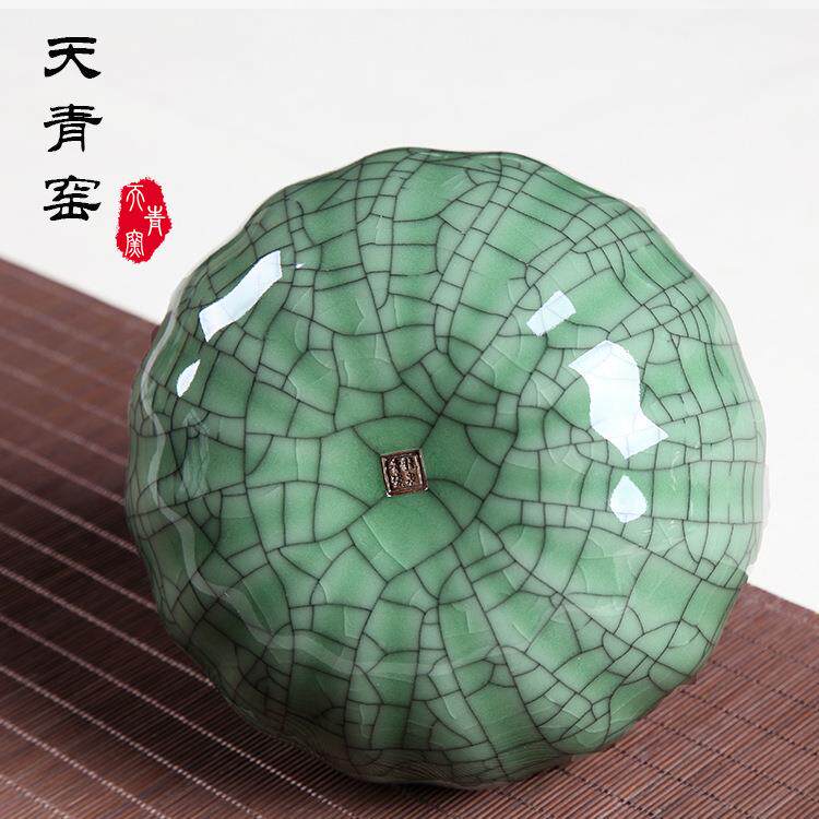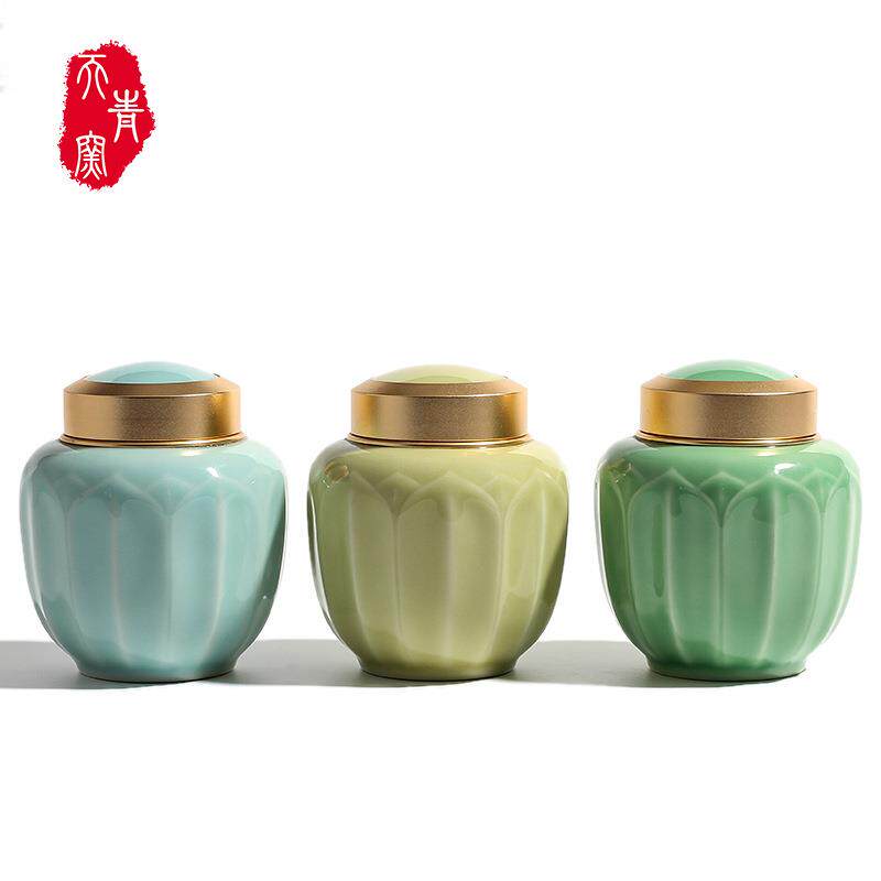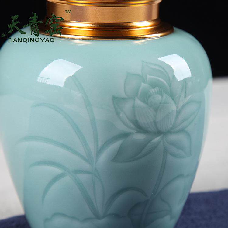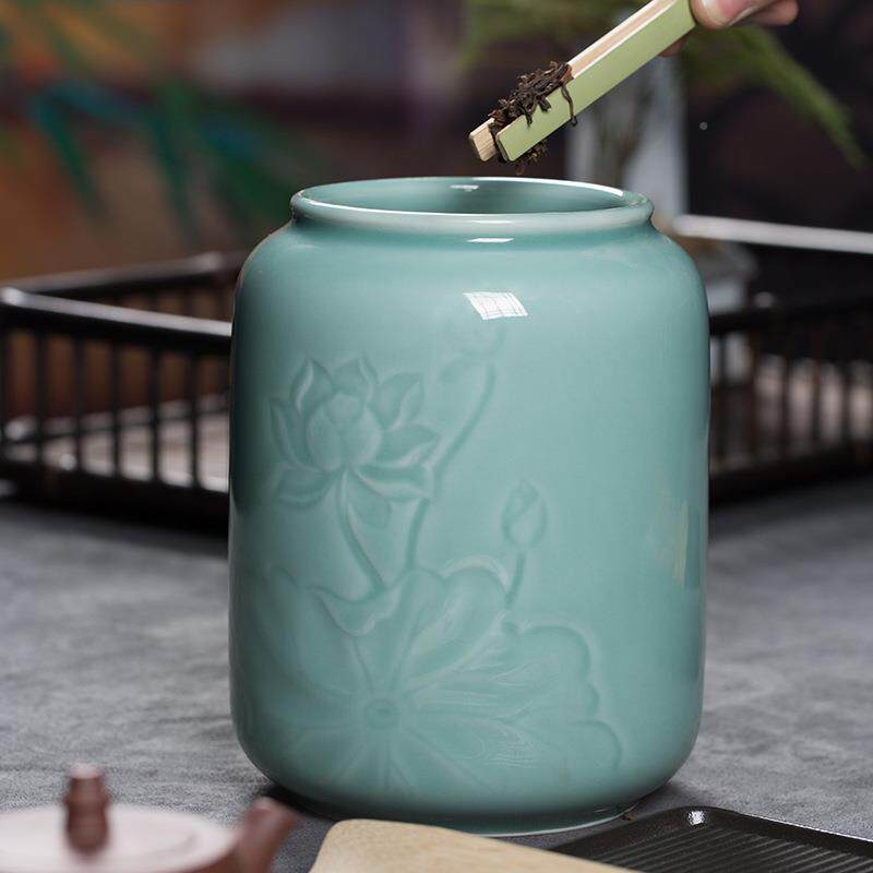 天窑龙泉青瓷花荷茶叶罐大号陶瓷青密封罐半斤红茶普洱包EMS茶装