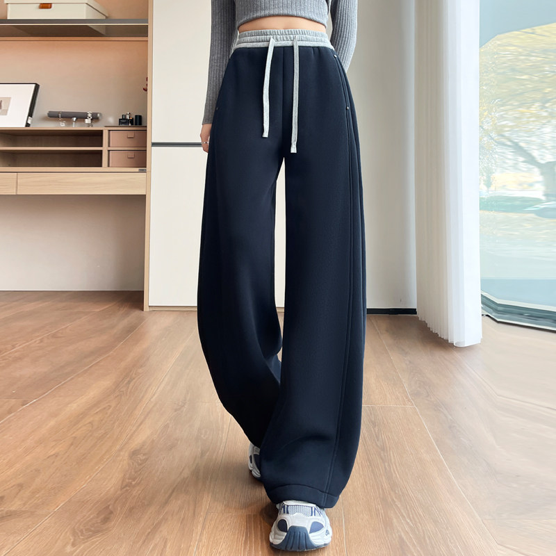 初中学生藏青色运动卫裤女秋冬美式加厚加绒宽松直筒弯刀休闲裤子