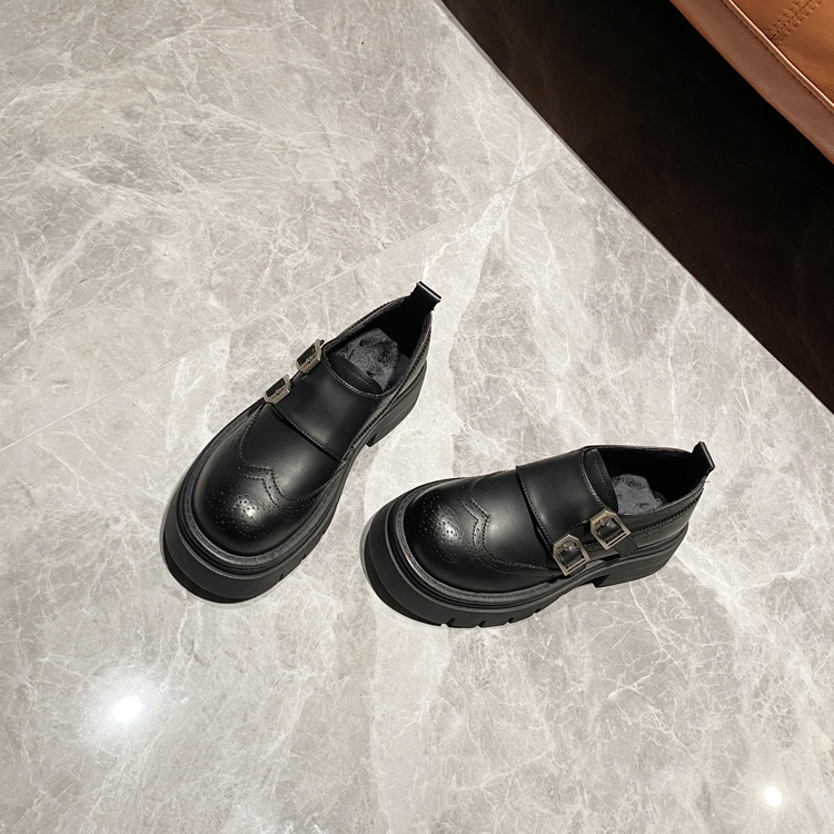布洛克雕花~韩国单真皮加绒厚底乐福鞋女2024冬新款小皮鞋jk女鞋