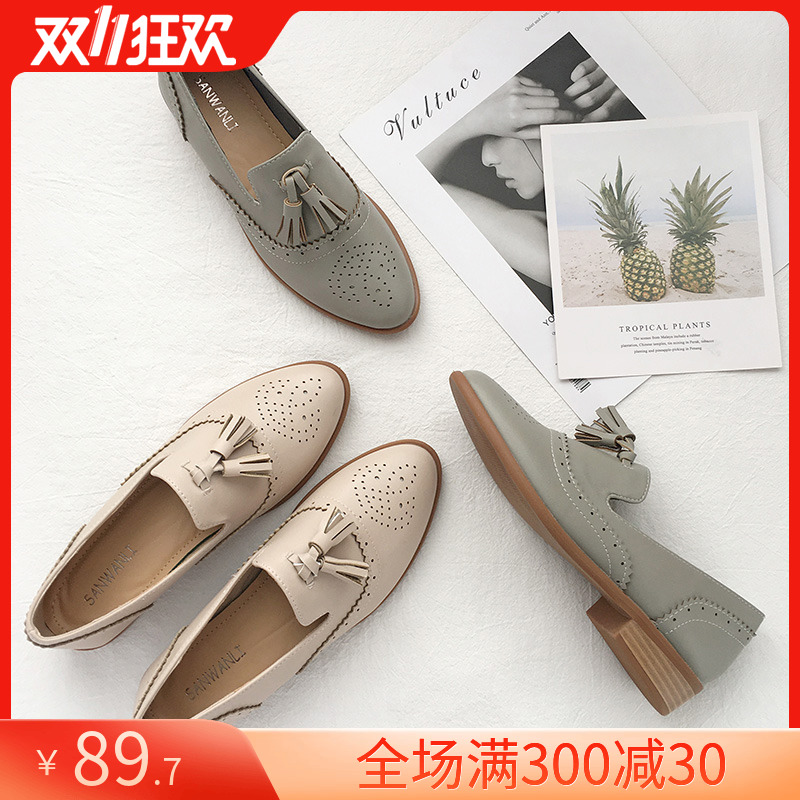 尖头福乐鞋小皮鞋女流苏软皮雕花一脚蹬英伦风复古布洛克单鞋秋冬