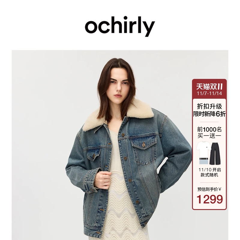 OCHIRLY欧时力 可拆卸毛绒翻领棉衣牛仔外套女休闲2025秋冬新品