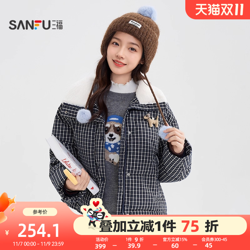三福棉衣女2025冬季立体小狗装饰棉服毛绒翻领格子外套女装511302