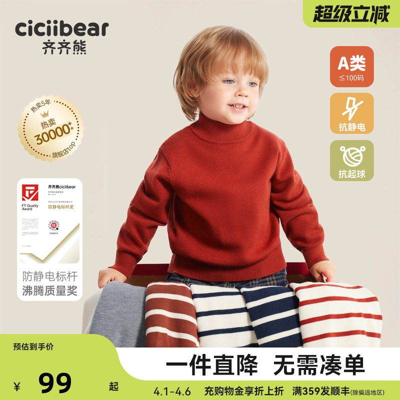 齐齐熊男童红色毛衣冬儿童半高领宝宝条纹打底衫针织新年毛线上衣