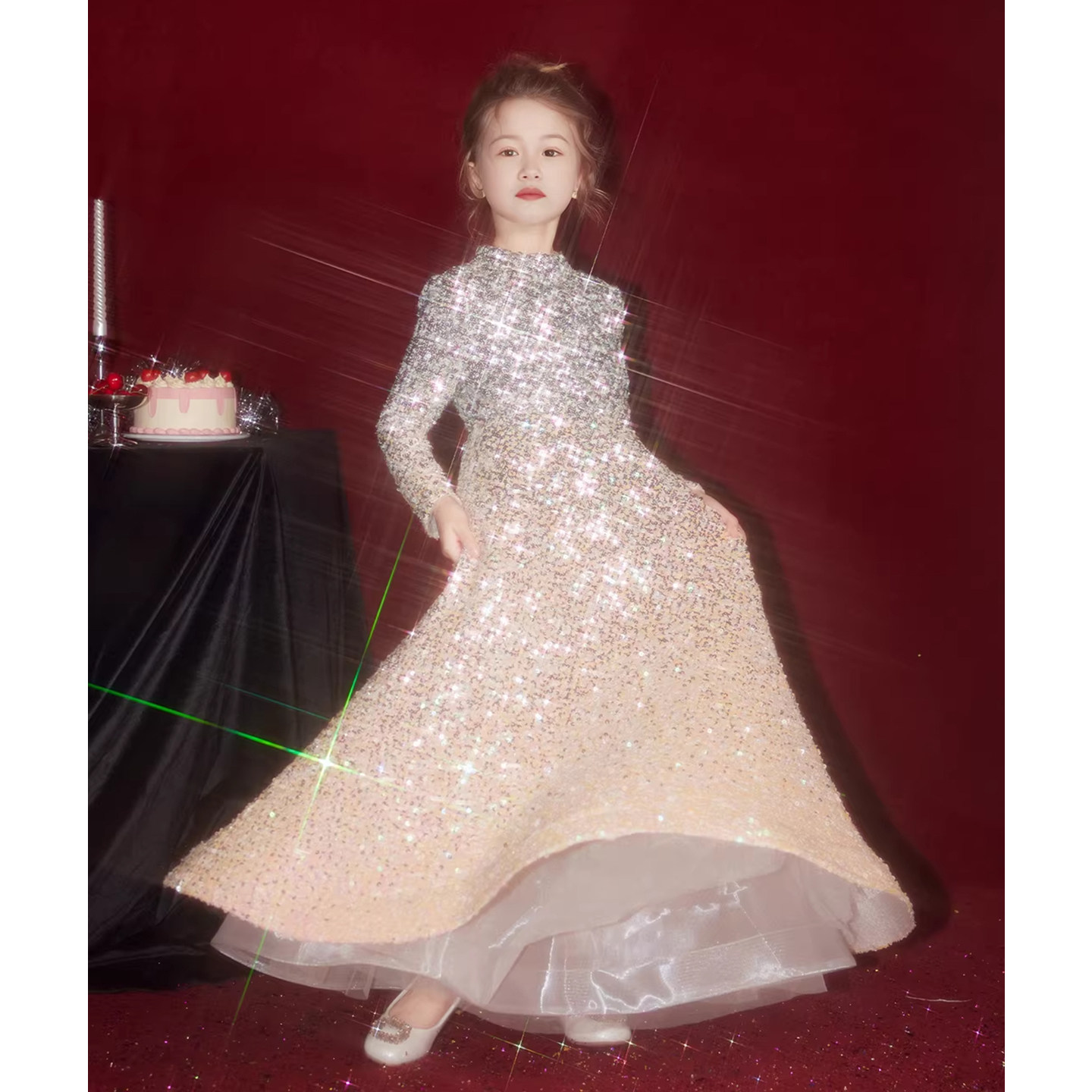 新款女童香槟亮片网纱蓬蓬裙儿童钢琴演出服秋冬长袖元旦主持表演