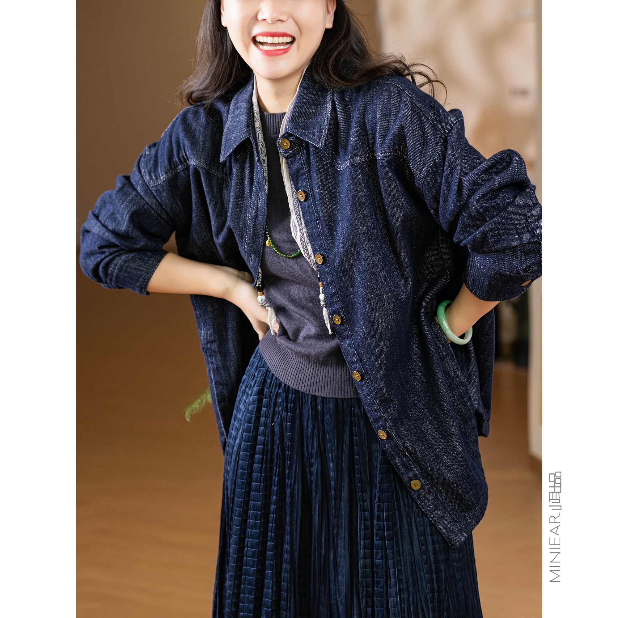 小耳出品 双纱织法/拉丝肌理/100棉 翻领牛仔复古时尚宽松外套女