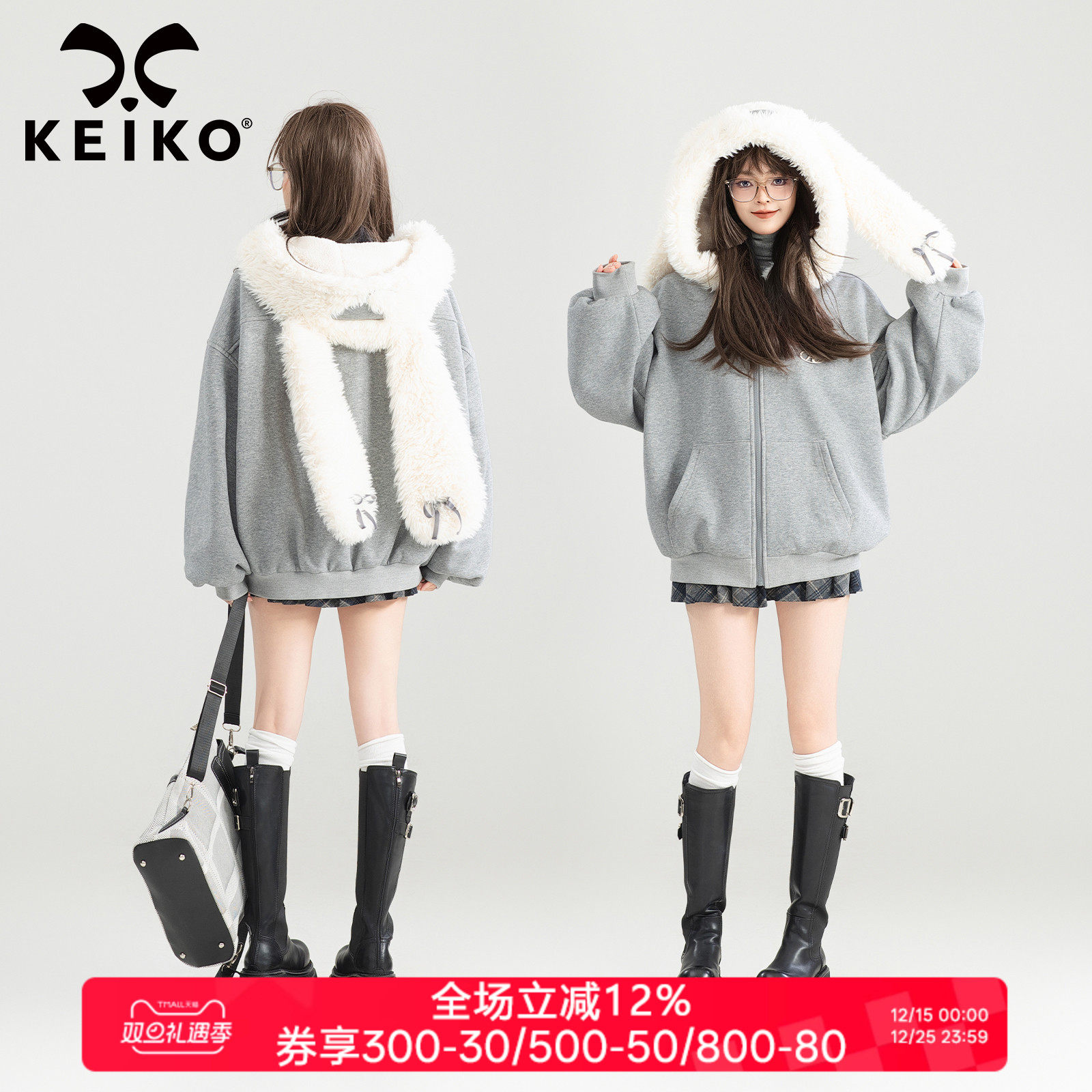 KEIKO 可爱兔耳连帽灰色宽松外套女25秋冬慵懒休闲拉链卫衣开衫