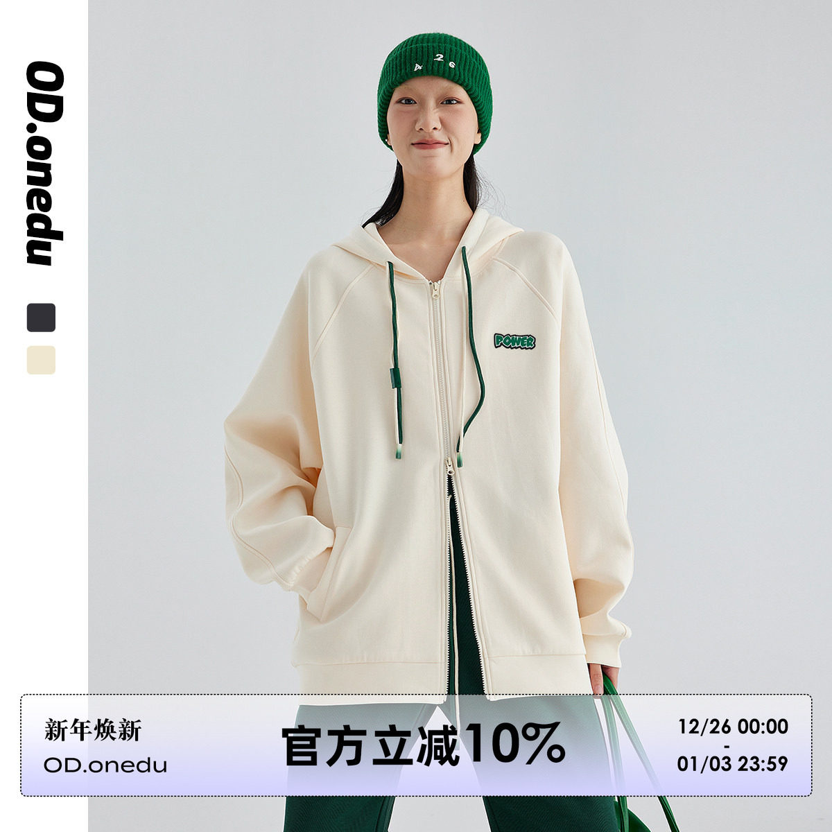 OD 双头拉链连帽空气层宽松外套女字母抽绳连帽卫衣开衫春秋新款