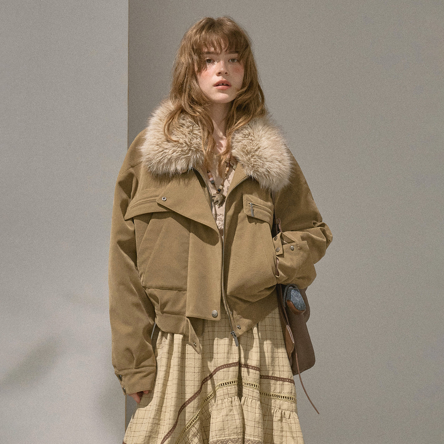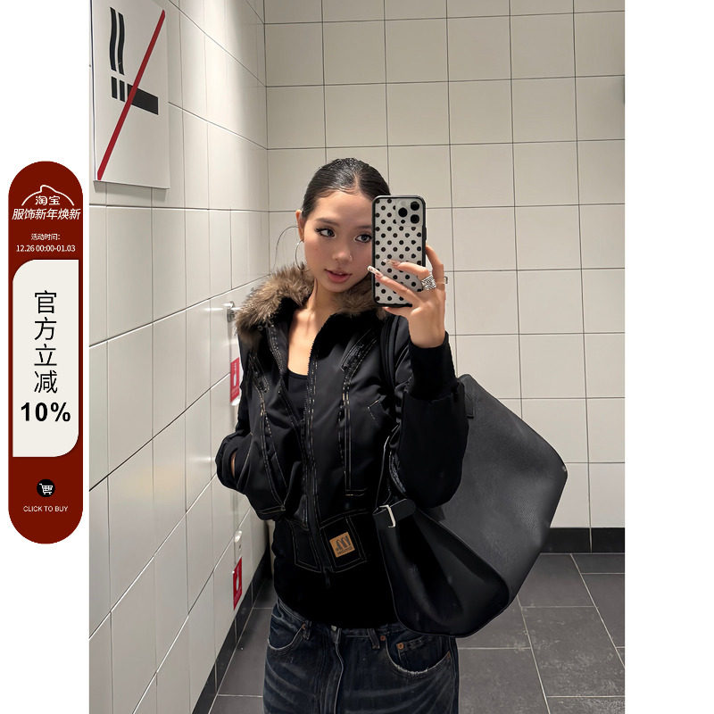 DIDDIMODA 水洗pu毛领口袋工装宽松外套女短款2025冬季新款