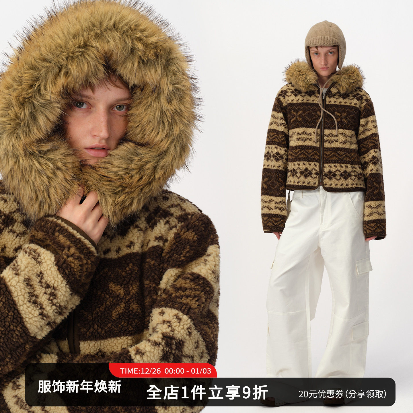 SMIIILE毛领可拆卸复古费尔岛提花摇粒绒连帽短款宽松外套女冬季
