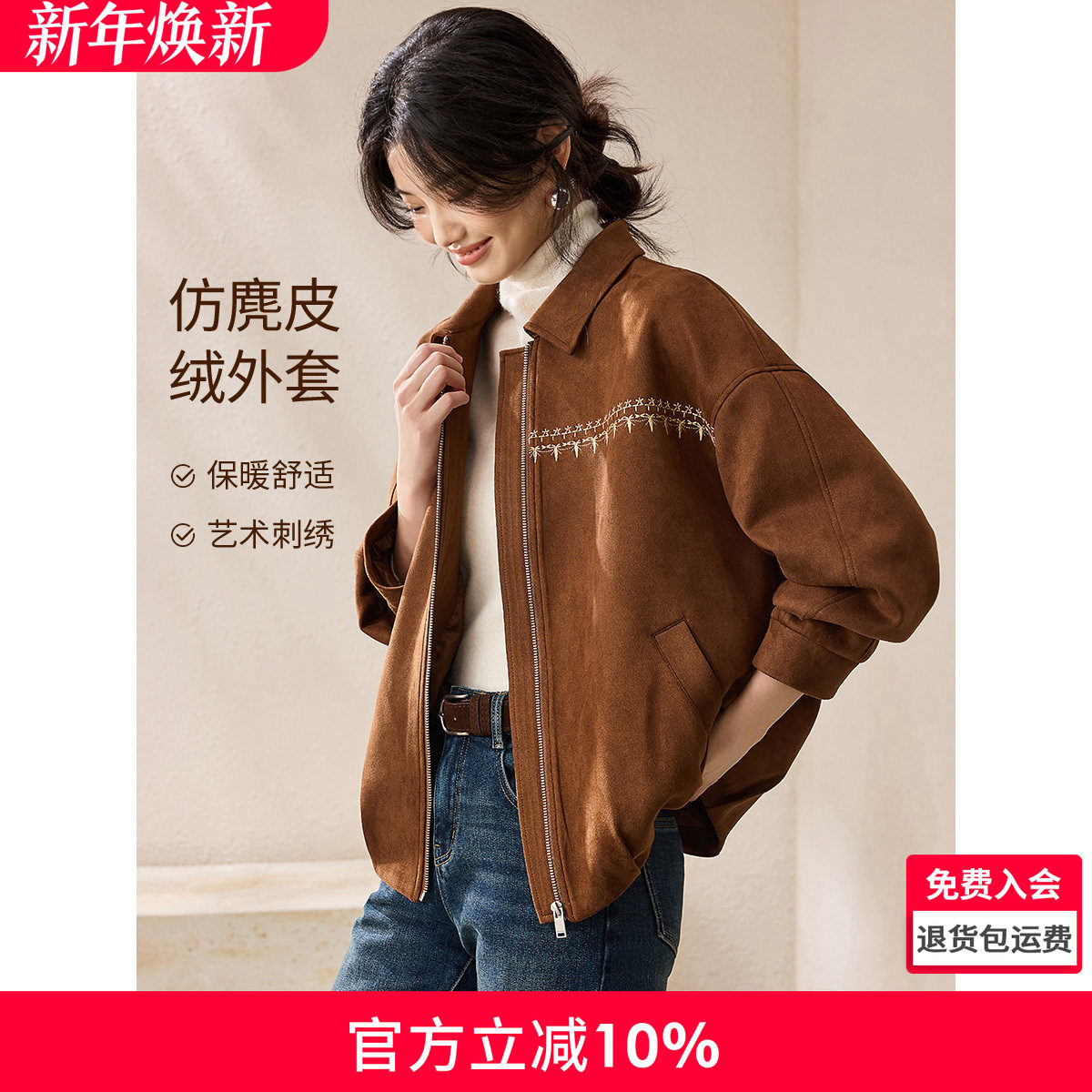 沫晗依美嬉皮风收褶短款麂皮夹克2025秋季新款休闲复古宽松外套女