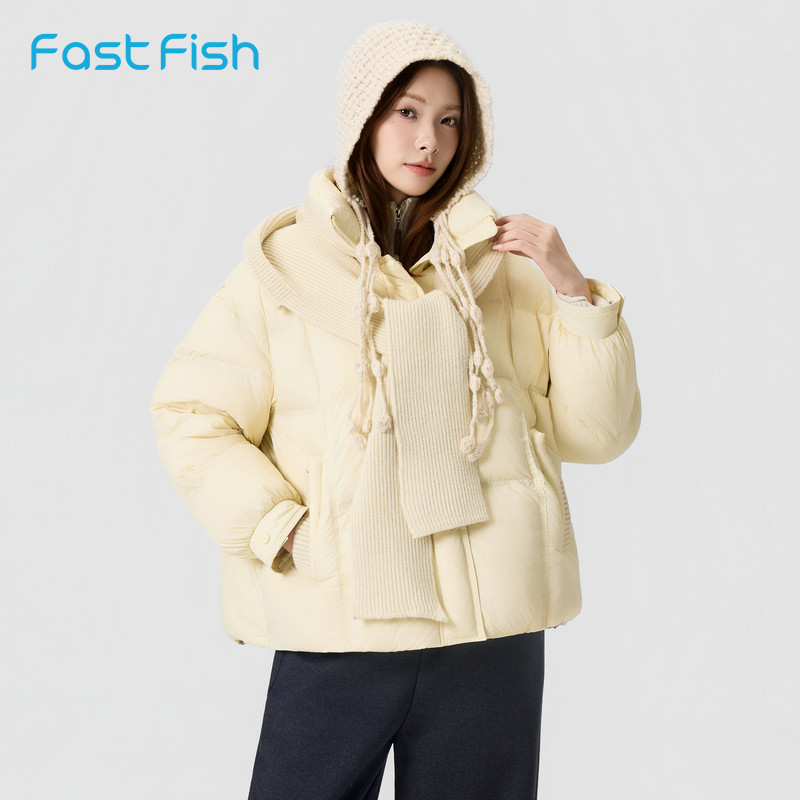 快鱼2025冬季新款针织拼接连帽羽绒服时尚保暖宽松外套女士羽绒衣