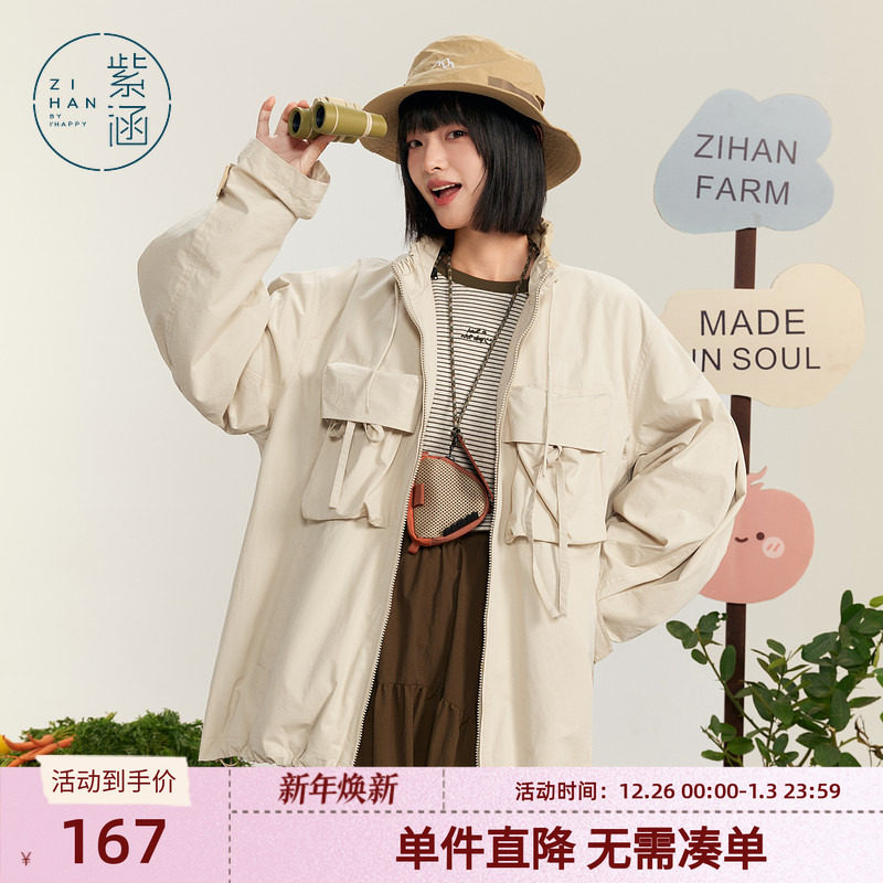 紫涵工装风户外宽松外套女秋季新款通勤大口袋纯棉中长款拉链上衣