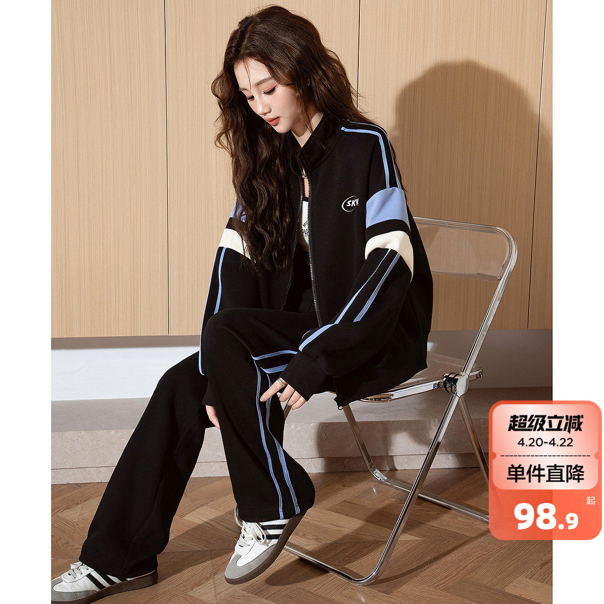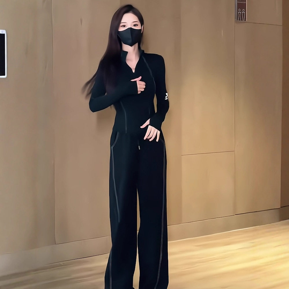 休闲运动服黑色翻领长袖卫衣阔腿裤女2026春秋新款高级感两件套装