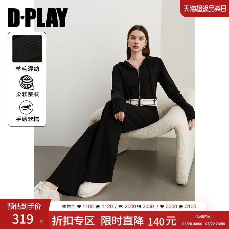 pusumede 黑色连帽拉链卫衣女春秋休闲喇叭裤a字针织包臀短裙套装