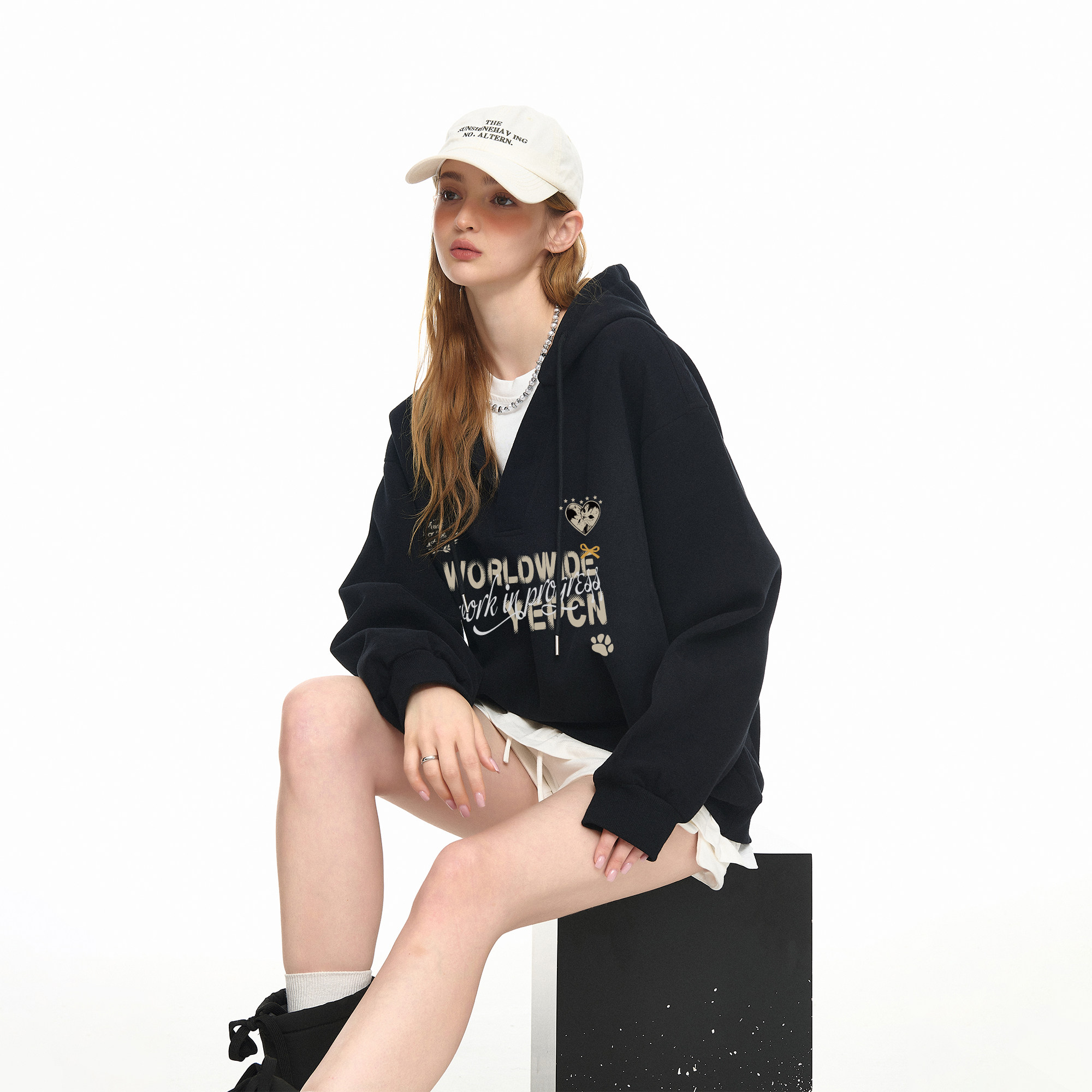 ziziFe春秋季设计感不规则半身裙连帽黑色卫衣外套休闲长裤套装女