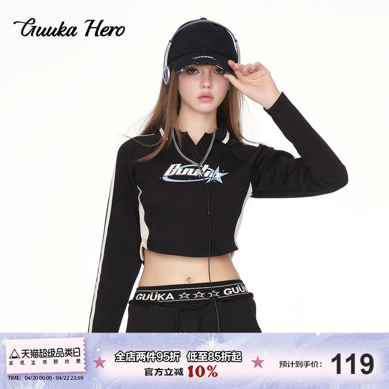 GUUKAHERO黑色美式短款卫衣女 修身上衣长袖千禧辣妹风半身裙套装