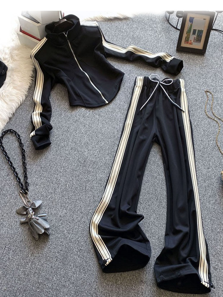 2026春季新款黑色休闲套装女显瘦条纹拉链卫衣阔腿裤运动服两件套