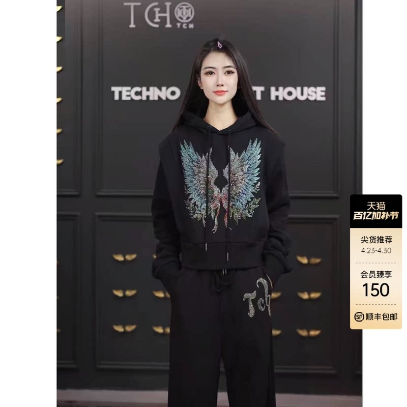 TCH时尚潮牌烫钻炫彩翅膀黑色连帽卫衣休闲裤套装女T78B07E1001
