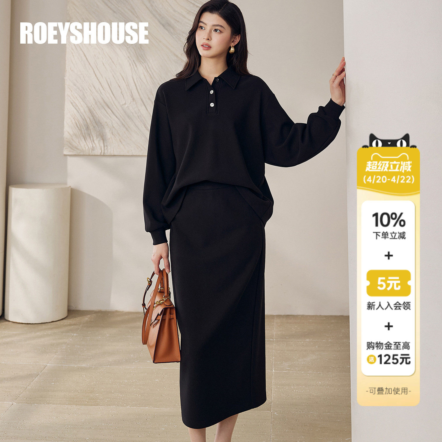 罗衣休闲通勤黑色显瘦针织套装女春职场翻领卫衣半裙两件套12690