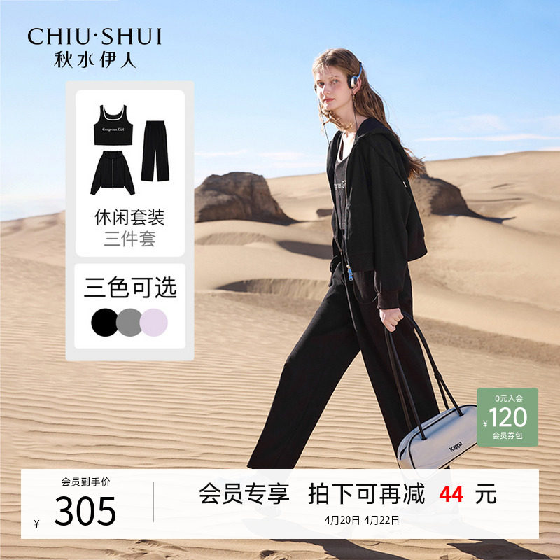 秋水伊人休闲连帽卫衣套装2026春季新款高级女装黑色运动三件套