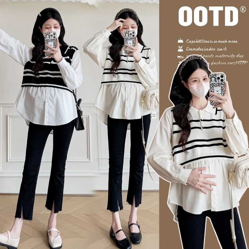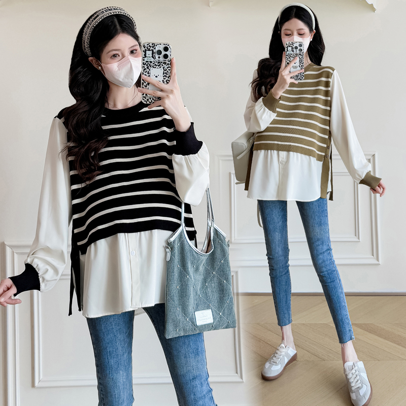 孕妇装秋装假两件拼接条纹长袖上衣2025新款孕妇衬衫秋季怀孕衣服