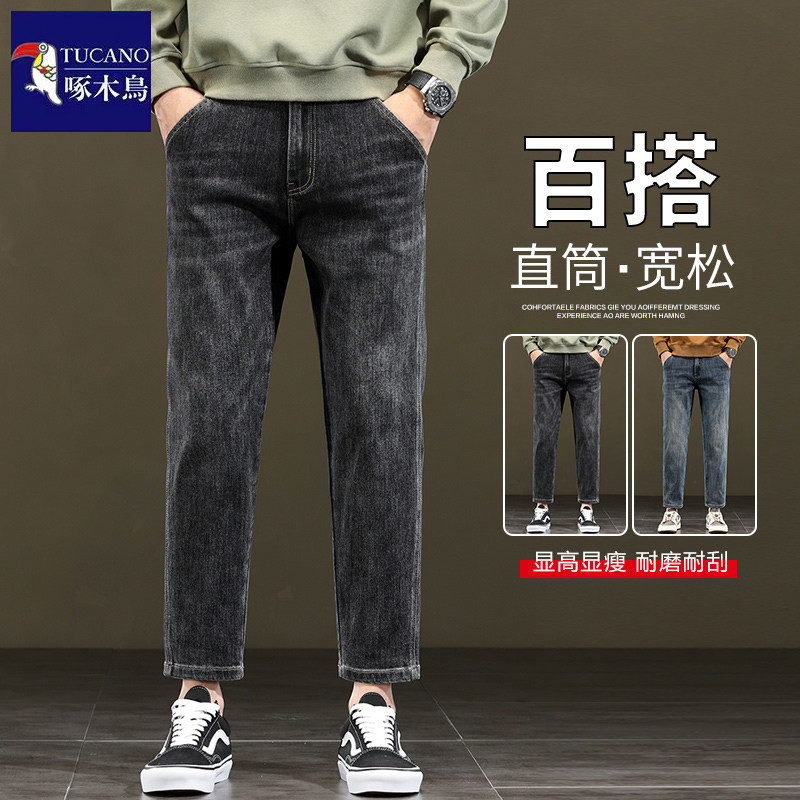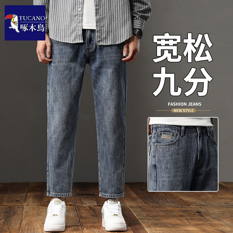啄木鸟轻奢九分牛仔裤男生秋冬新款纯棉休闲潮牌百搭宽松直筒裤子