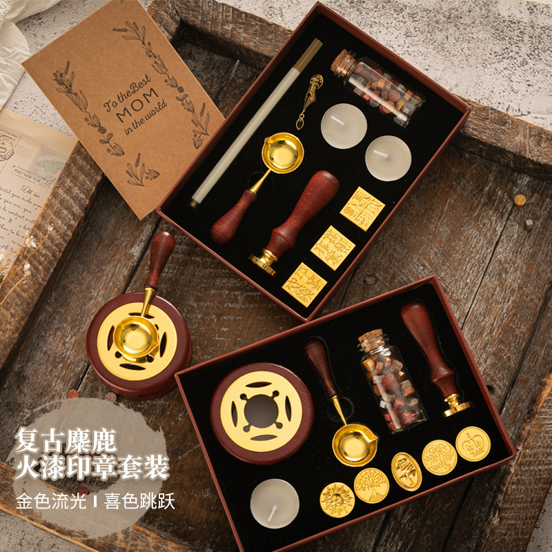 火漆印章套装复古麋鹿礼盒火漆炉印章小圆蜡套装木质手柄火漆套装