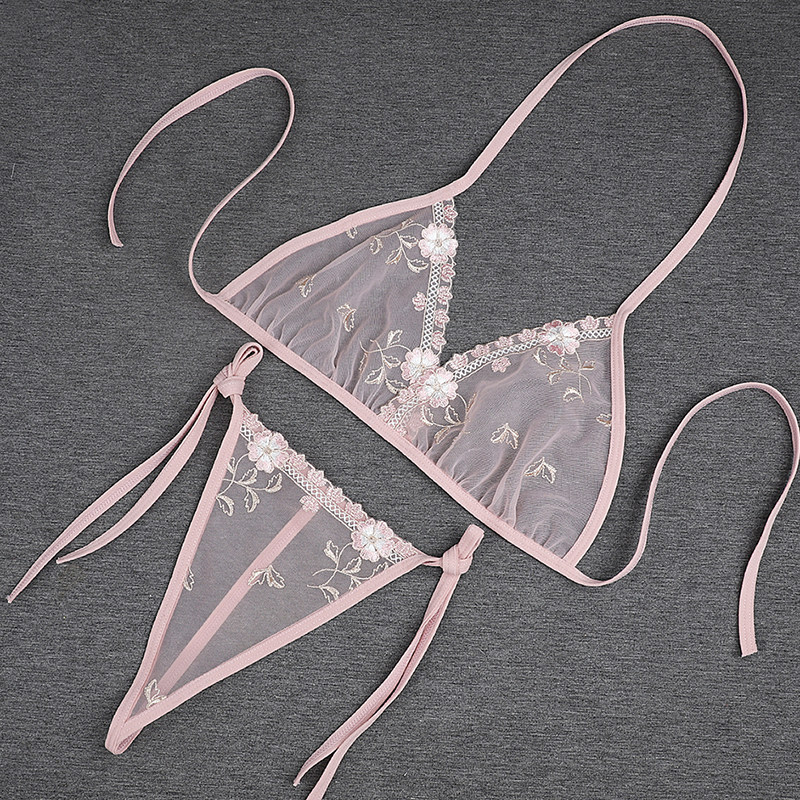 尾货欧美刺绣花朵内衣女性感透明超款绑带挂脖比基尼纯欲文胸套装