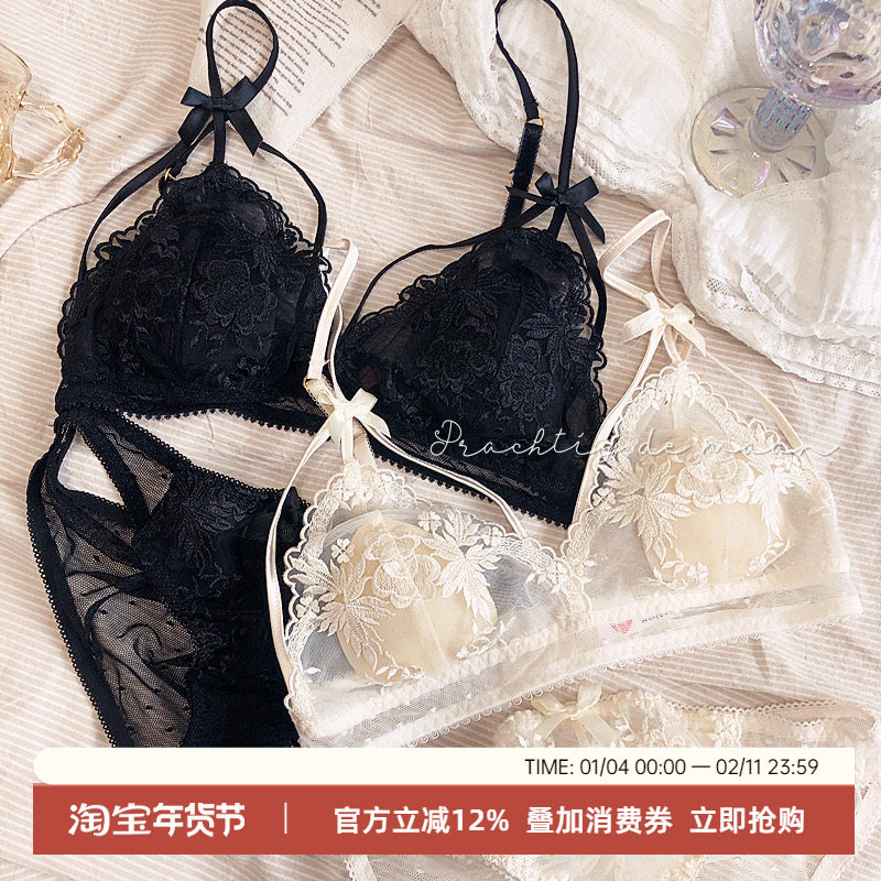 法式薄刺绣蕾丝三角杯无钢圈性感透明文胸套装水晶杯小胸内衣奶罩