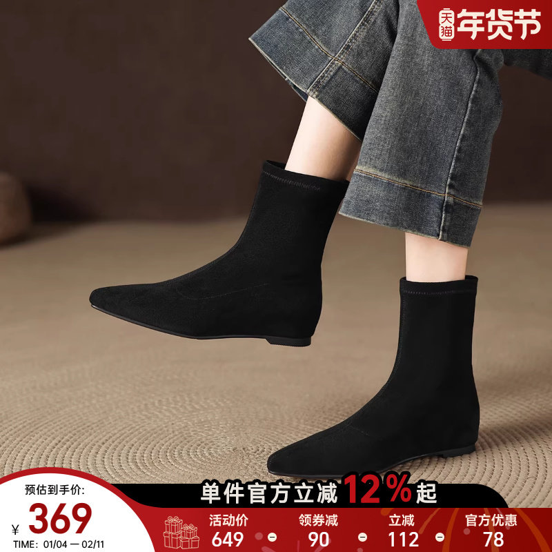 加绒中筒靴女2026春季新款磨砂绒面短筒靴平底防滑内增高时装靴子